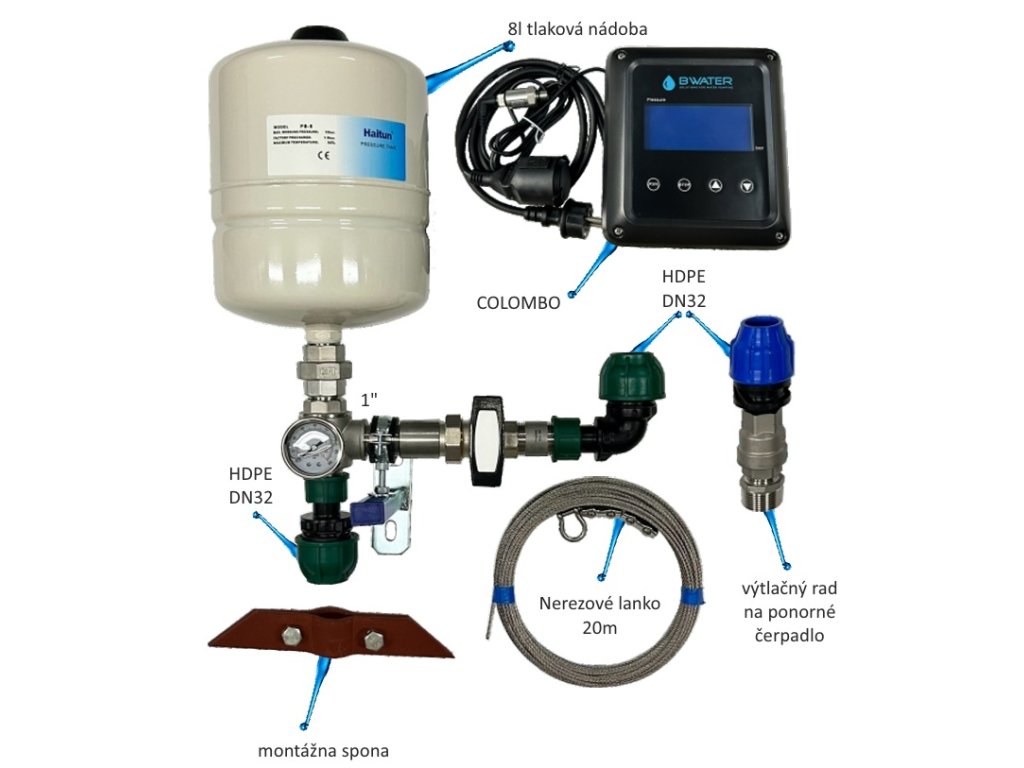 Súčasťou zostavy je tlaková nádoba s membránou, ktorá stabilizuje tlak v systéme a obmedzuje časté spínanie čerpadla. Základné armatúry sú dodané v jednom inštalačnom sete pre rýchlu a prehľadnú montáž.