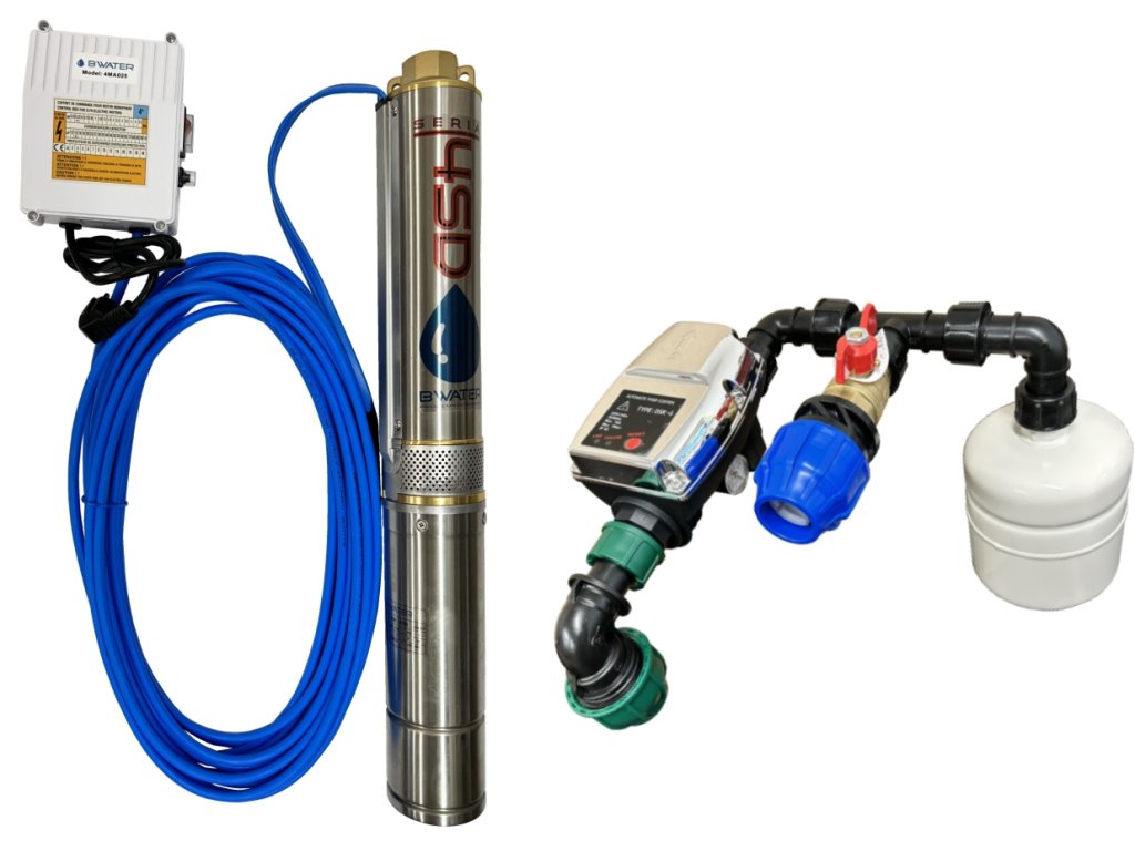 Zostava obsahuje ponorné čerpadlo na 230 V, určené do vrtaných studní, dodávané s 20-metrovým napájacím káblom. Každé čerpadlo je vybavené kondenzátorovou skrinkou, ktorá obsahuje tepelnú poistku, hlavný vypínač a kondenzátor, čím je zabezpečená ochrana a dlhá životnosť čerpadla.