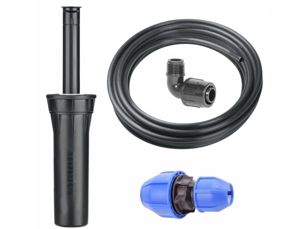 Sada postrekovača Hunter PROS-04 s tvarovkami IRRITEC je určená na ukončenie zavlažovacej vetvy z LDPE 25 mm potrubia pomocou LDPE hadice 20 mm, ktorá je pripojená cez redukovanú kompresnú spojku 25 × 20 mm.