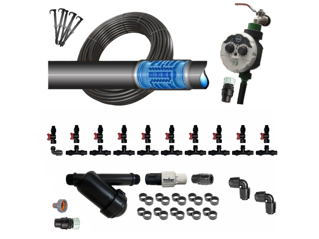 Oproti základnému setu je prívodná hadica predĺžená na dĺžku 20 m, a je vyhotovená z čierneho LDPE materiálu. Súčasťou balenia sú aj dve holendrové spojky, ktoré umožňujú priame prepojenie systému s polyetylénovou (LDPE) hadicou namiesto klasickej záhradnej hadice. Zároveň set obsahuje aj rýchlospojky na bežnú záhradnú hadicu, takže používateľ má možnosť voľby spôsobu napojenia. Ak má k dispozícii vlastnú čiernu hadicu, môže systém pripojiť priamo bez použitia holendrových spojok. Dôležité je, aby prívodná hadica nebola priesvitná, pretože v priesvitných hadiciach môže dochádzať k tvorbe rias, ktoré zanášajú filter a znižujú spoľahlivosť celého systému.
