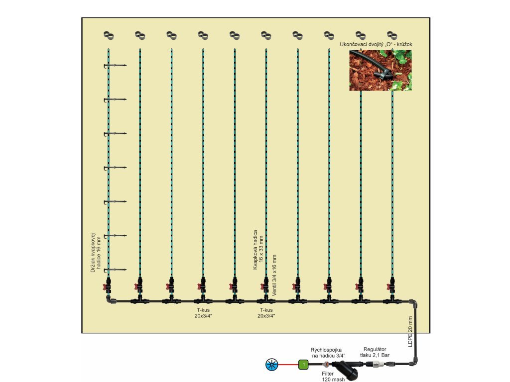 - 10 zavlažovacích radov s dĺžkou 10 m