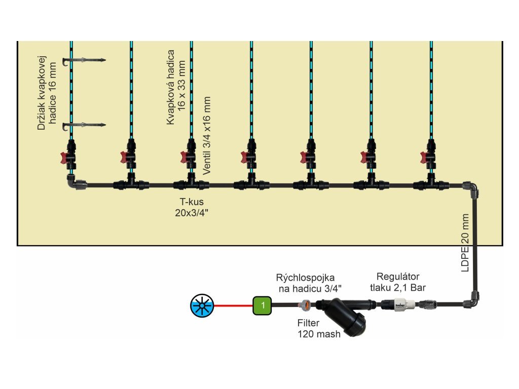 Súčasťou systému je regulátor tlaku, ktorý zabezpečuje správne pracovné podmienky pre kvapkovú hadicu a chráni celý systém pred poškodením spôsobeným vysokým vstupným tlakom.