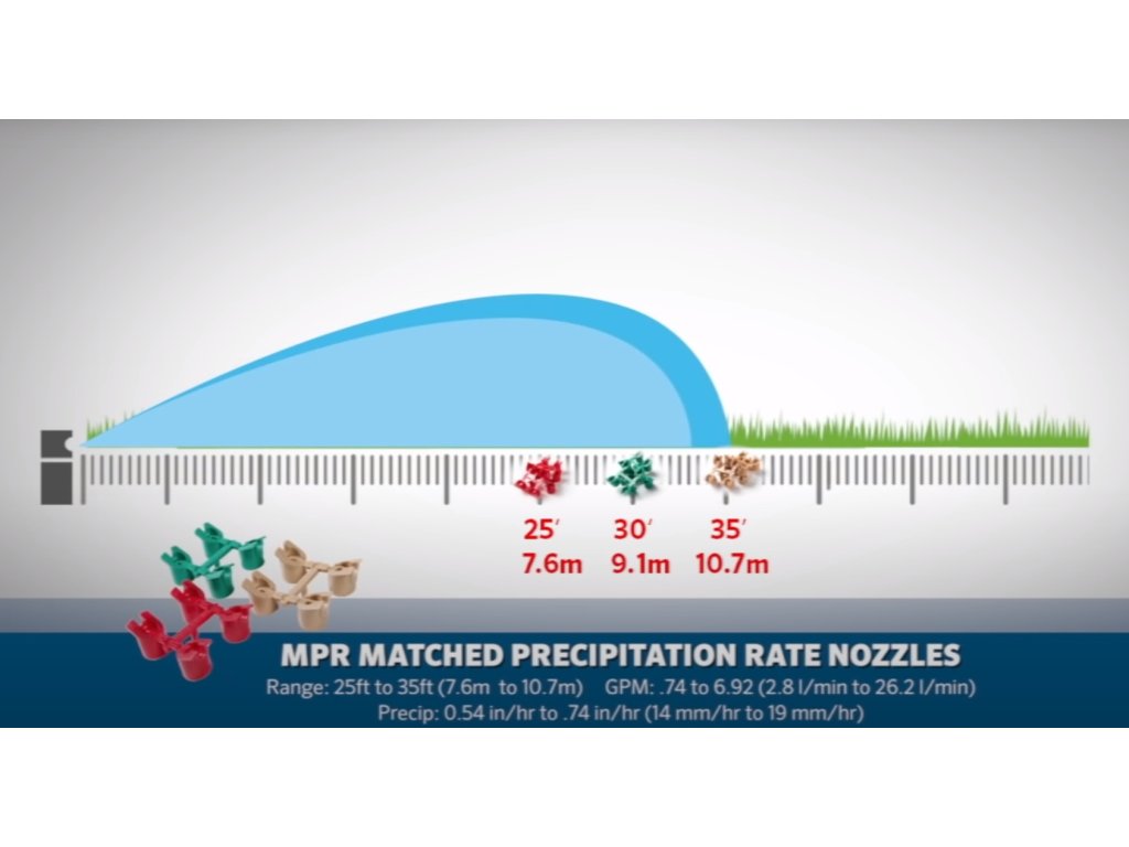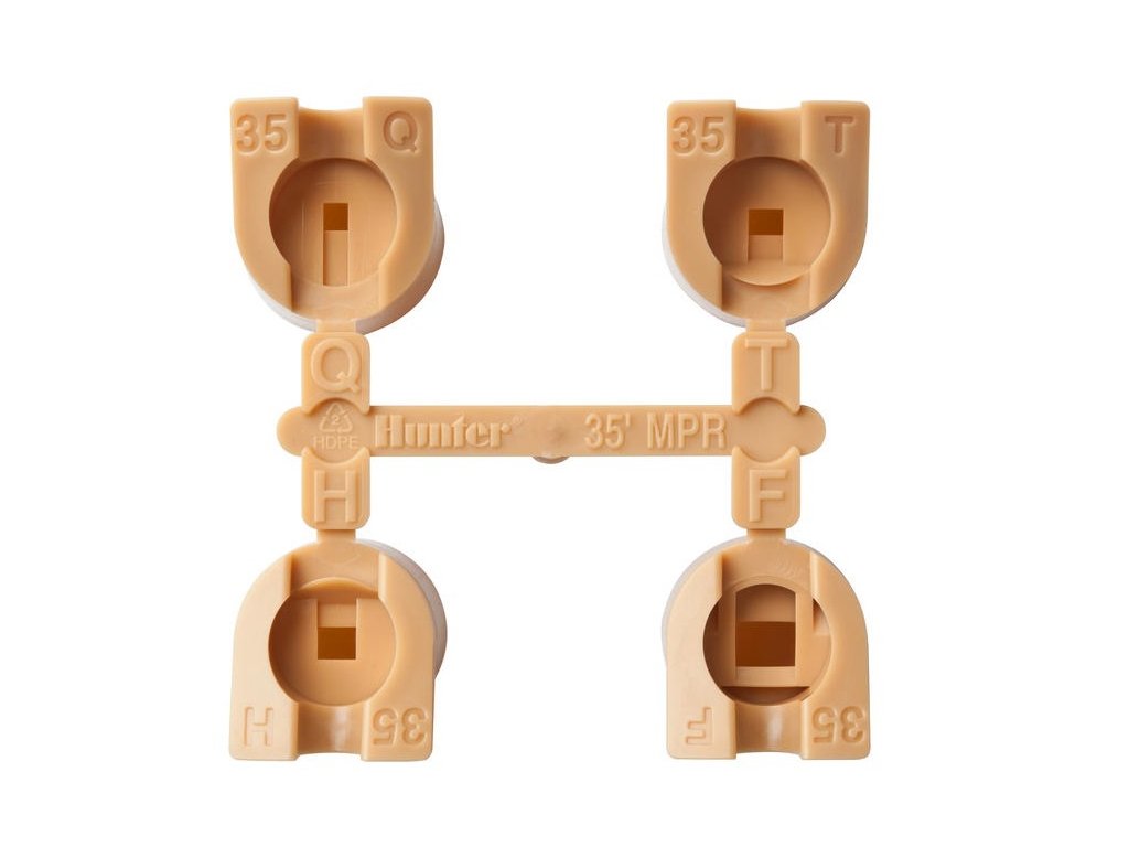 Sada trysiek MPR-35 je určená pre rotačné postrekovače Hunter PGP Ultra a I-20 a poskytuje presné, efektívne zavlažovanie väčších trávnatých plôch či záhrad. Vďaka technológii Matched Precipitation Rate (MPR) zabezpečujú tieto trysky rovnakú zrážkovú výšku pri všetkých uhlových nastaveniach, čím minimalizujú nerovnomerné zavlažovanie a plytvanie vodou.
