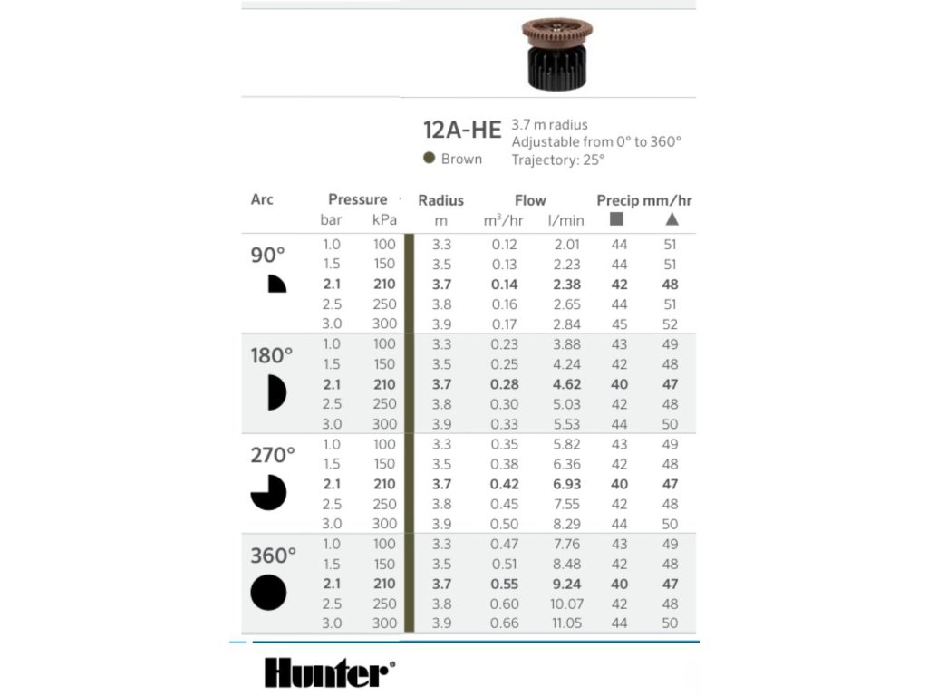 Tryska Hunter 12 HE je súčasťou série High Efficiency trysiek určených pre presné a úsporné zavlažovanie menších a stredne veľkých plôch. Vytvára jemný, rovnomerný rozptyl vody, ktorý zabezpečuje stabilné pokrytie celej zavlažovanej oblasti.