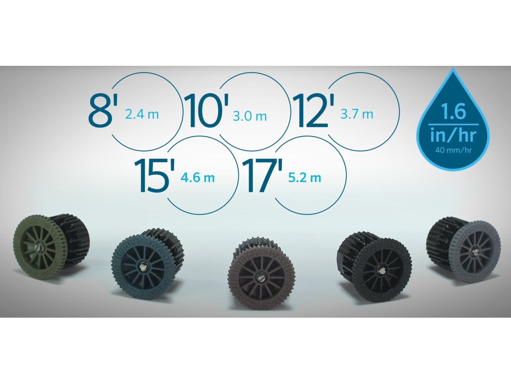 Maximálny dosah trysky je 4,6 m. Je možné jemne prispôsobiť pokrytie presným rozmerom plochy tak, aby nevznikali presahy ani suché miesta. Jemný sprayový rozptyl zaručuje rovnomerné zavlažovanie vo všetkých častiach plochy.