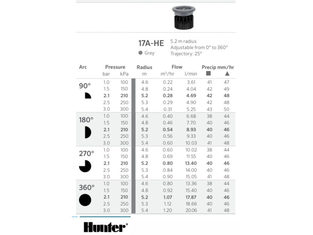 Tryska Hunter 17 HE je najväčším modelom zo série High Efficiency trysiek a je určená pre presné zavlažovanie väčších trávnikových plôch. Poskytuje vysokú rovnomernosť postreku, stabilný výkon a úspornú prevádzku aj pri nižšom tlaku vody.