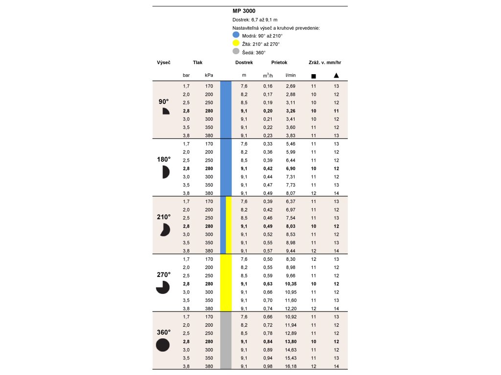 - Prietok: približne 13,04 l/min podľa uhla výseče