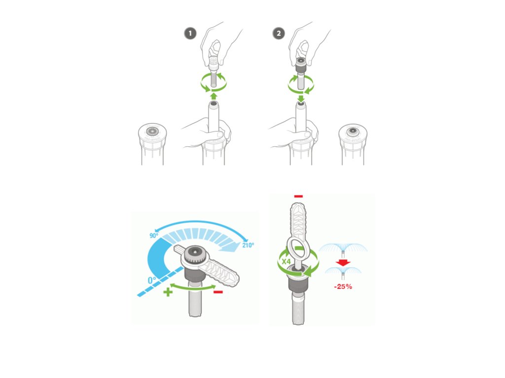 Továrenské nastavenie trysky je vždy na maximálny dostrek 3,1 m. Pomocou nastavovacieho kľúča MP Tool možno lúč vody plynulo skrátiť až o približne 25 %, teda na približne 2,3 m. Vzdialenosť aj uhol výseče sa dajú podľa potreby presne doladiť, aby ste dosiahli ideálne pokrytie plochy bez prekrývania alebo presahov.