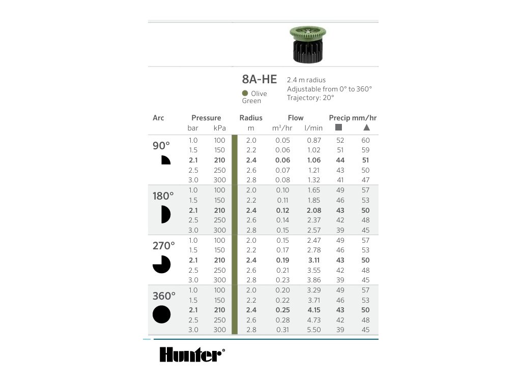 Trysky HE (High Efficiency) sú konštruované tak, aby poskytovali rovnomerný postrek aj pri nižších tlakových podmienkach. Ich ideálny pracovný tlak je 2,1 bar, pri ktorom dosahujú najlepšiu rovnomernosť a pokrytie. Jemné kvapky obmedzujú straty spôsobené vetrom a odparom, čím zvyšujú účinnosť celého systému.