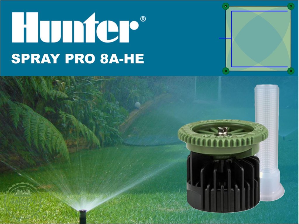 Tento závlahový set je navrhnutý pre menšie štvorcové trávniky, ktoré vyžadujú pravidelné a rovnomerné zavlažovanie. Tryska Hunter 8A-HE poskytuje sprayový postrek s maximálnym dosahom 2,4 m, čo je ideálne pre menšie štvorcové záhrady. Postrek je jemný a rovnomerný, takže efektívne pokrýva celú plochu bez presahov mimo trávnika.